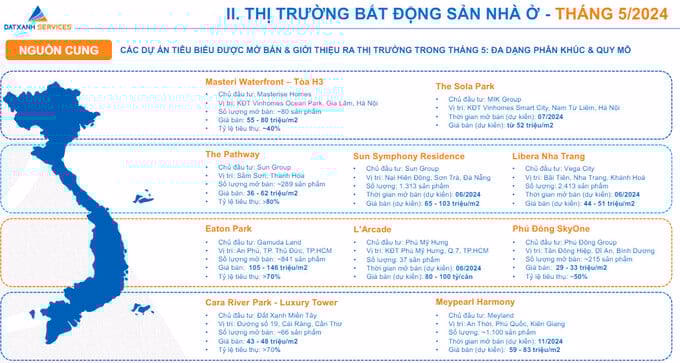 Cũng theo DatXanh Services, đơn vị cho rằng, nguồn cung mới trong tháng 5 có sự sụt giảm, phần lớn đến từ phân khúc căn hộ trung và cao cấp. Nguồn cung trong tháng 6 dự kiến sẽ có sự cải thiện hơn và đa dạng loại hình sản phẩm, đến từ các dự án đã và đang được truyền thông nhưng chưa mở bán.