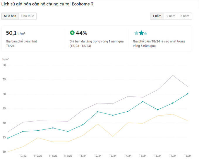 Theo tìm hiểu, dự án nhà ở xã hội Ecohome được bàn giao vào năm 2020, với giá chủ đầu tư ban đầu là 16,5 triệu đồng/m2. Như vậy, giá trị căn hộ tại đây hiện đã tăng gấp 2,7 lần so với giá gốc.