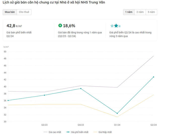 Đến nay, giá bán căn hộ tại NHS Trung Văn đã tăng gấp đôi, dao động từ 40-42 triệu đồng/m2 đối với căn hộ xã hội, và 49 triệu đồng/m2 cho căn thương mại.