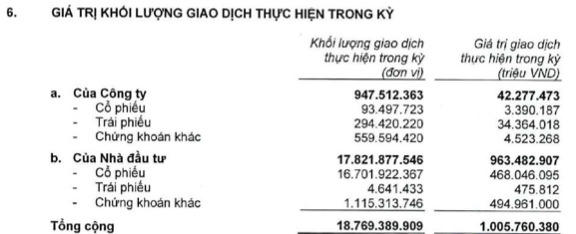 Báo cáo tài chính soát xét bán niên 2022 ghi nhận tình hình kinh doanh 6 tháng đầu năm 2022 với tổng giá trị giao dịch trong kỳ đạt hơn 1 triệu tỷ đồng, trong đó giao dịch của các nhà đầu tư đạt 963.483 tỷ đồng, tập trung vào giao dịch cổ phiếu (468.046 tỷ đồng) và chứng khoán khác (gần 495.000 tỷ đồng).