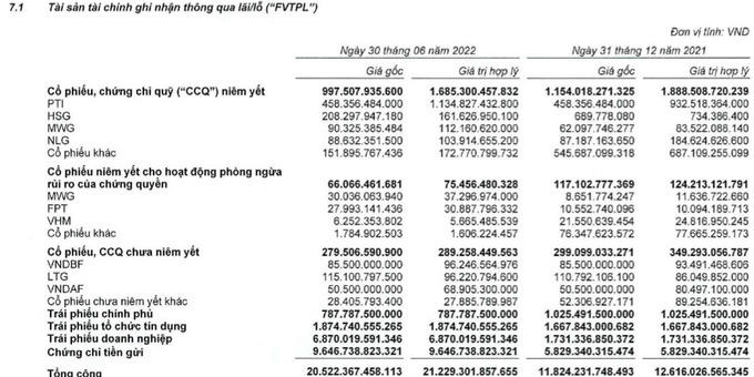 “Soi” danh mục đầu tư cổ phiếu niêm yết của VnDirect thì thấy tổng giá trị đầu tư gần 1.000 tỷ đồng giá gốc (đến 30/6/2022) trong đó tỷ trọng đầu tư vào cổ phiếu PTI và HSG là nhiều nhất, ngoài ra danh mục còn có MWG và NLG. Tạm tính, giá trị hợp lý đến 30/6/2022 VnDirect “tạm lãi” cho khoản đầu tư cổ phiếu, chứng chỉ quỹ niêm yết gần 700 tỷ đồng – và tổng tạm lãi các khoản đầu tư tài chính thông qua lãi/lỗ FVTPL khoảng 700 tỷ đồng.