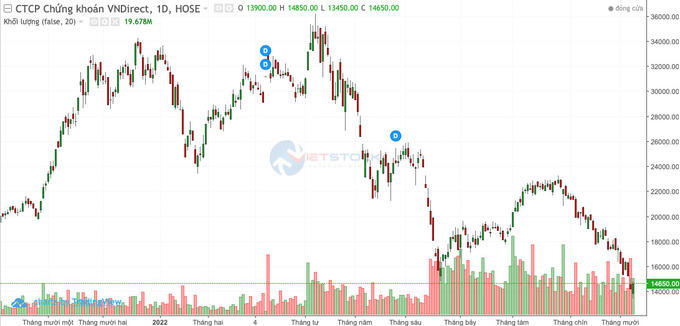 Vốn hoá thị trường của VnDirect cũng “bay” từ 42.000 tỷ đồng thời điểm đầu tháng 4/2022 xuống dưới 20.000 đồng/cổ phiếu như hiện nay khi giá cổ phiếu VND giảm từ vùng giá xấp xỉ 35.000 đồng/cổ phiếu xuống dưới 15.000 đồng/cổ phiếu.