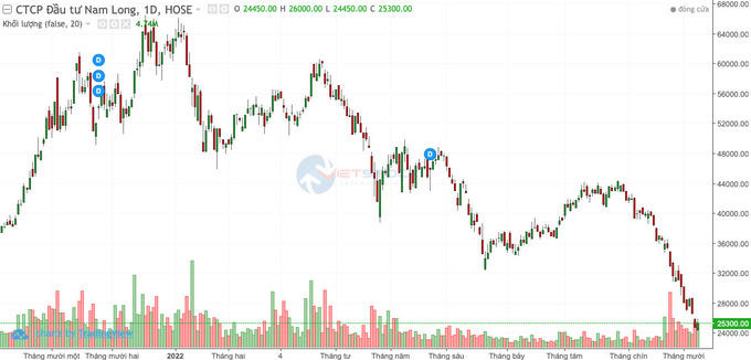 NLG của Nam Long cũng giảm khoảng 30% tính từ thời điểm cuối tháng 6 đến nay, xuyên thủng đáy 1 năm và đang dò về đáy của khoảng 2 năm trở lại đây.