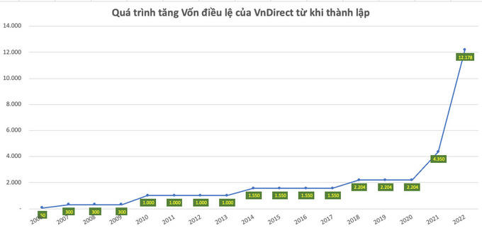 Chưa hết năm 2022, Vndirect đã thực hiện đợt tăng vốn với tỷ lệ tăng rất lớn, từ 4.350 tỷ đồng lên 12.178 tỷ đồng tương ứng tăng gấp 2,8 lần ban đầu và gấp hơn 5 lần cùng thời điểm này năm ngoái.