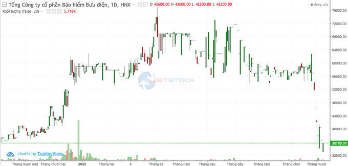 Điển hình như PTI của Bảo Hiểm bưu điện đã giảm hơn một nửa, vừa giảm sàn về mức 33.000 đồng/cổ phiếu. Còn nếu tính tại thời điểm 30/9/2022 khi kết thúc quý 2, PTI cũng đóng cửa ở mức 46.800 đồng/cổ phiếu, giảm 35% so với thời điểm kết thúc quý 2/2022.