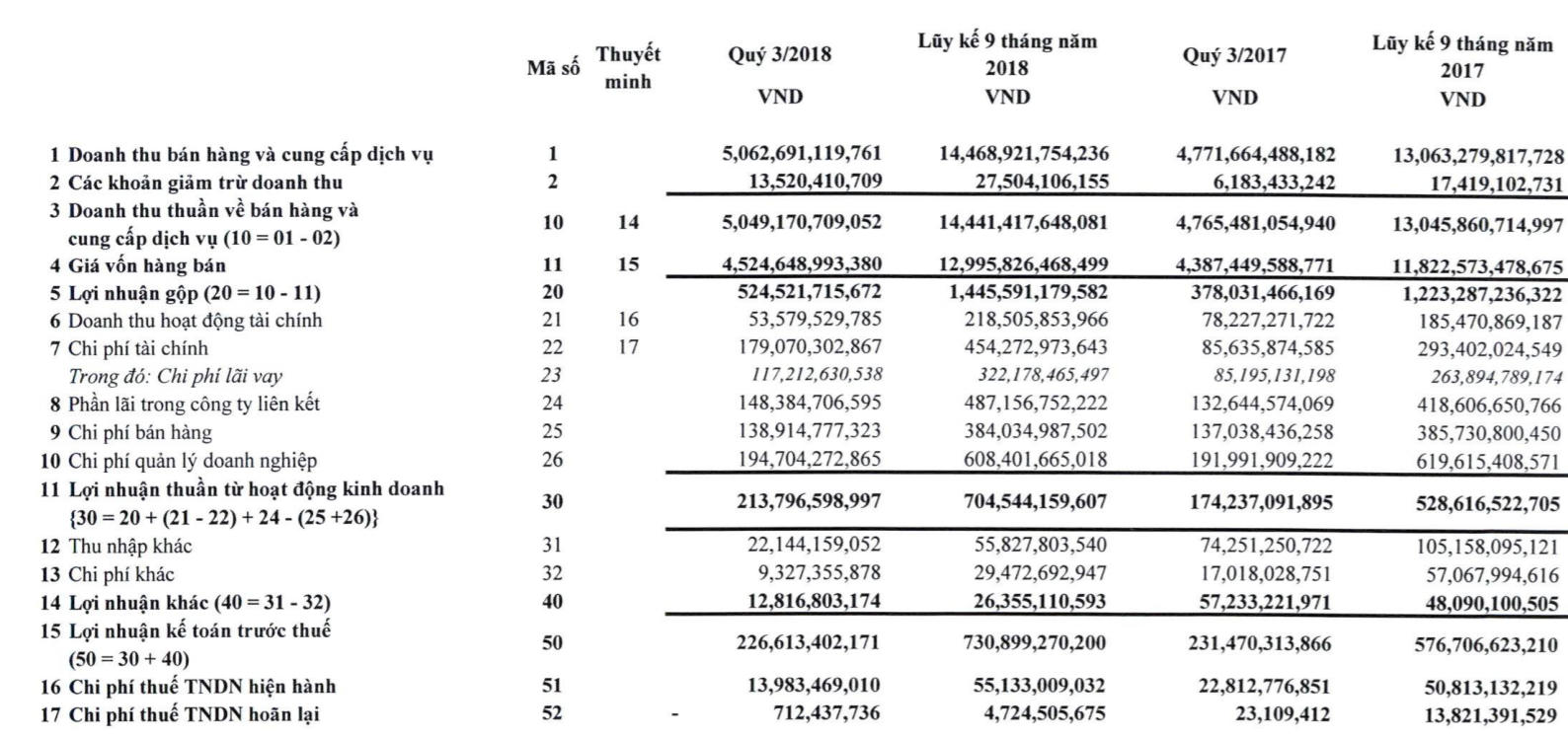 Hoạt động tài chính 9 tháng đầu năm đạt doanh thu 218 tỷ đồng, cùng kỳ là 185 tỷ đồng. Trong kỳ, doanh thu tài chính tăng 33 tỷ đồng so với cùng kỳ chủ yếu nhờ ghi nhận 64 tỷ đồng lãi từ thanh lý các khoản đầu tư.