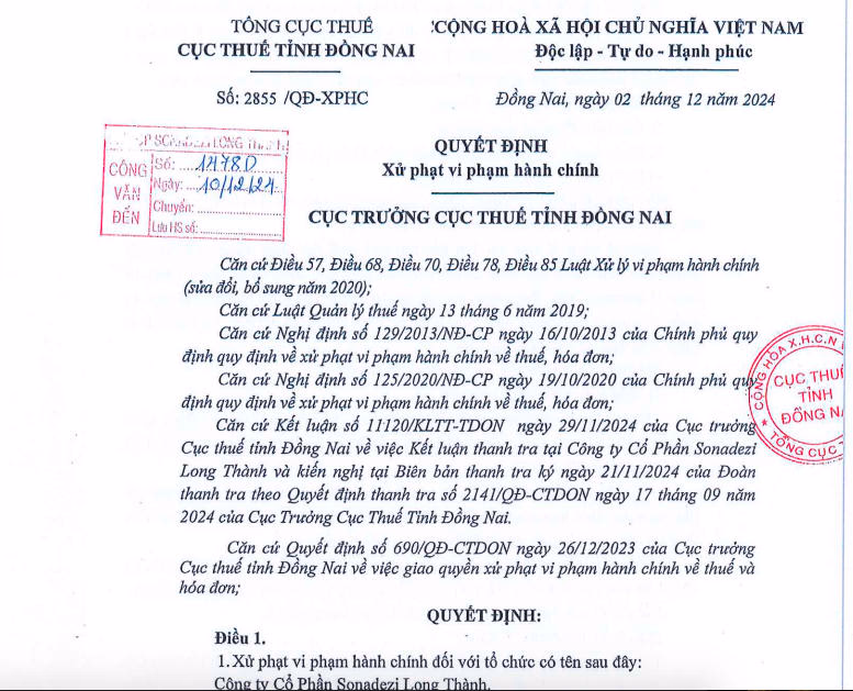 Công ty cổ phần Sonadezi Long Thành vừa công bố thông tin nhận được quyết định xử phạt hành chính về thuế của Cục thuế tỉnh Đồng Nai vì kê khai sai, dẫn đến thiếu số tiền thuế phải nộp từ năm 2019-2022.