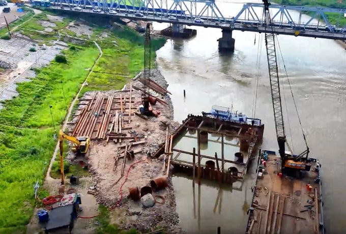 Hiện trên công trường của 2 dự án cầu đường bộ và đường sắt đều đang có hàng chục công nhân và nhiều trang thiết bị máy móc tất bật thi công nhằm đảm bảo tiến độ đã đề ra.
