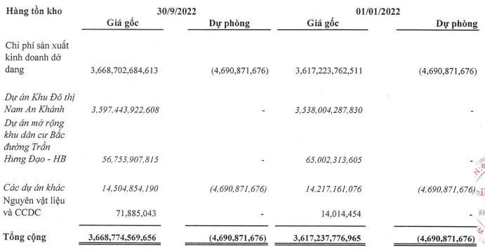 Trong kỳ, tồn kho chủ yếu 3.597,4 tỷ đồng Dự án Khu đô thị Nam An Khánh; Ngoài ra, tài sản dở dang dài hạn chủ yếu 1.230,8 tỷ đồng dự án Hòa Hải – Đà Nẵng, 538,9 tỷ đồng dự án Văn La –Văn Khê, 177,2 tỷ đồng dự án Khu đô thị Mỹ Đình – Mễ Trì, 156,3 tỷ đồng dự án Tiến Xuân, 109 tỷ đồng dự án Khu đô thị Nam An Khánh mở rộng …