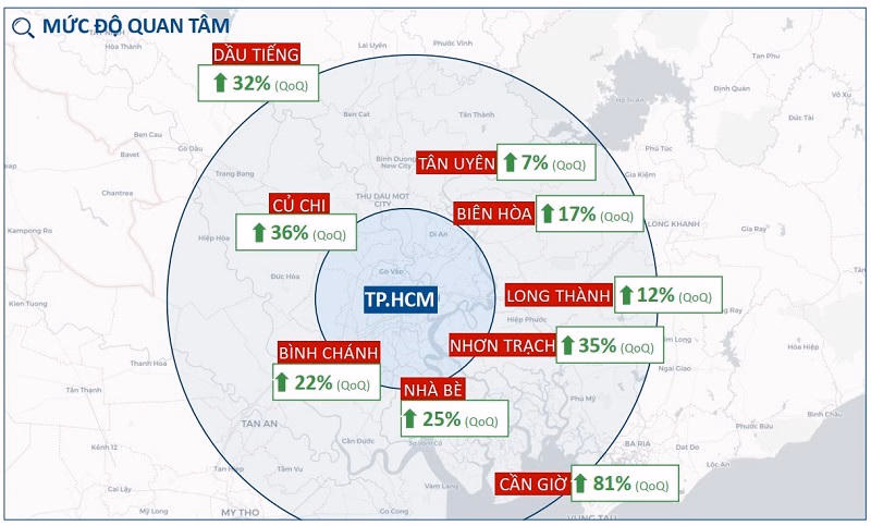 Cũng theo số liệu báo cáo từ Batdongsan.com.vn, chỉ riêng trong 3 tháng đầu năm, sức mua BĐS trên cả nước đã tăng 37% so với cùng kỳ 2020, thậm chí lượng quan tâm tìm kiếm BĐS còn cao vượt hơn những giai đoạn sốt đất 2018-2019. Xét riêng tại TP Hồ Chí Minh, nếu khu vực trung tâm và TP Thủ Đức có lượng tìm kiếm nhà đất ít biến động do thiếu hụt nguồn cung, khu vực 5 huyện ngoại thành là Củ Chi, Hóc Môn, Bình Chánh, Cần Giờ và Nhà Bè lại có lượng khách hàng tìm kiếm nhà đất tăng trung bình từ 20-30%, đặc biệt là tại huyện Cần Giờ và Củ Chi có mức tăng lần lượt 81% và 36%.
