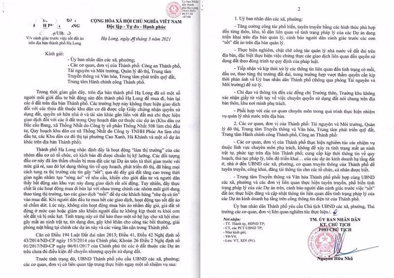 Trước đó ngày 19/3 UBND TP Hạ Long cũng đã có văn bản chỉ đạo các đơn vị liên quan và cảnh báo người dân trước tình trạng sốt đất ảo trên địa bàn.