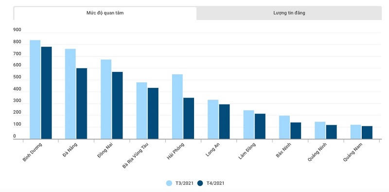 Tại những khu vực sốt đất trước đó, thị trường hiện tại đã không còn “nhảy múa”. Tính trên toàn thị trường, mức độ quan tâm trong tháng 4 đã giảm 18%. Các tỉnh từng là điểm nóng về bất động sản như Bắc Ninh, Hải Phòng, Quảng Ninh, Đà Nẵng, Bà Rịa – Vũng Tàu, Bình Dương, Đồng Nai… đều sụt giảm về mức độ quan tâm. Chẳng hạn, Hải Phòng giảm 36%, Bắc Ninh giảm 29%, Đà Nẵng giảm 21%… Dù thực tế thị trường đã chững lại nhưng mặt bằng giá đất không có sự sụt giảm mạnh. Nhiều nhà đầu tư vẫn đang e ngại có nên tham gia vào thị trường đất nền lúc này hay nên canh chừng đợi thời điểm và loại hình phù hợp hơn.