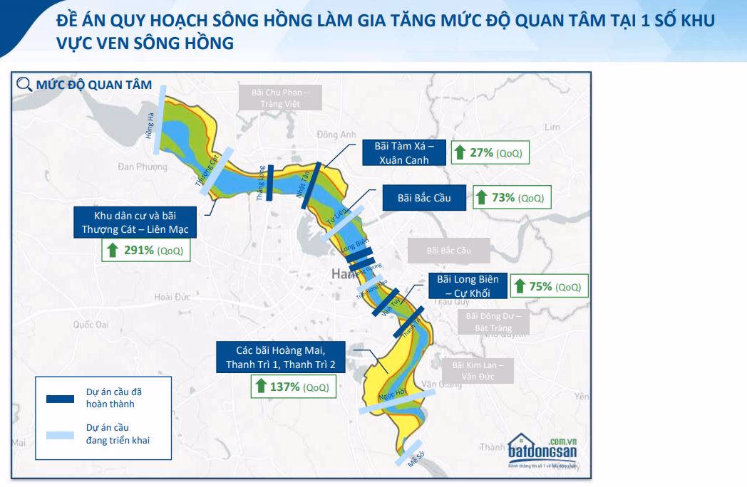 Theo đó mức độ quan tâm nhiều khu vực thuộc Bãi Thượng Cát, Liên Mạc tăng 291%, các bãi Hoàng Mai, Thanh Trì 1, Thanh Trì 2 tăng 137%, bãi Long Biên – Cự Khối tăng 75%, bãi Bắc Cầu tăng 73%, bãi Tàm Xá - Xuân Canh tăng 27%...