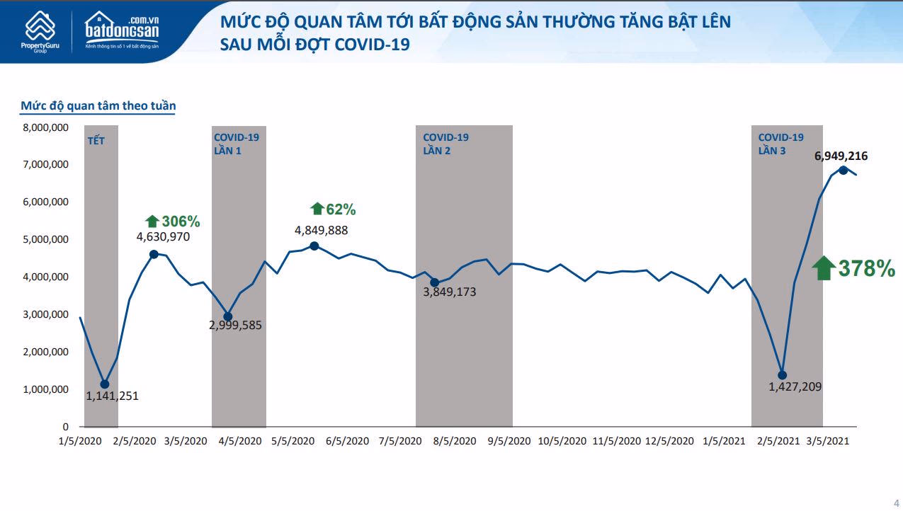 Theo dữ liệu của Batdongsan.com.vn, nếu như dịch Covid – 19 đợt 1 ảnh hưởng lớn đến tâm lý người mua, khiến lượng quan tâm đến bất động sản giảm mạnh thì ngay sau dịch đợt 1, sự quan tâm đã tăng vọt. Đợt dịch thứ 2 chỉ khiến cho mức độ quan tâm giảm nhẹ và đến đợt thứ 3 thì thị trường đã có sự chuẩn bị tâm lý rất tốt, để rồi bật mạnh ngay sau Tết. Và "cơn sốt đất" đã nổ ra ở nhiều địa phương.