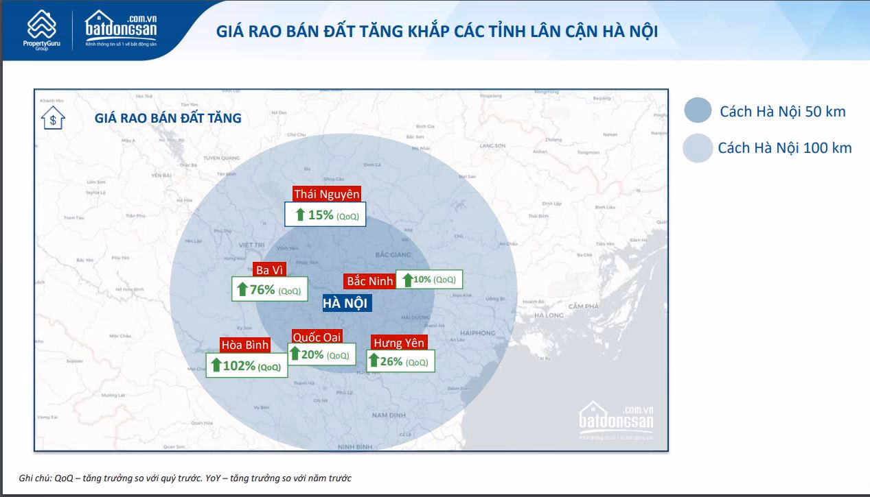 Điều này khiến giá rao bán đất tăng khắp các tỉnh lân cận Hà Nội, nhiều nơi có giá BĐS tăng vọt, thiết lập mặt bằng giá mới. Có thể kể đến như: Hòa Bình (tăng 102%), Ba Vì (tăng 75%), Hưng Yên (tăng 26%), Thái Nguyên (tăng 15%), Quốc Oai (tăng 20%), Bắc Ninh (tăng 10%)…