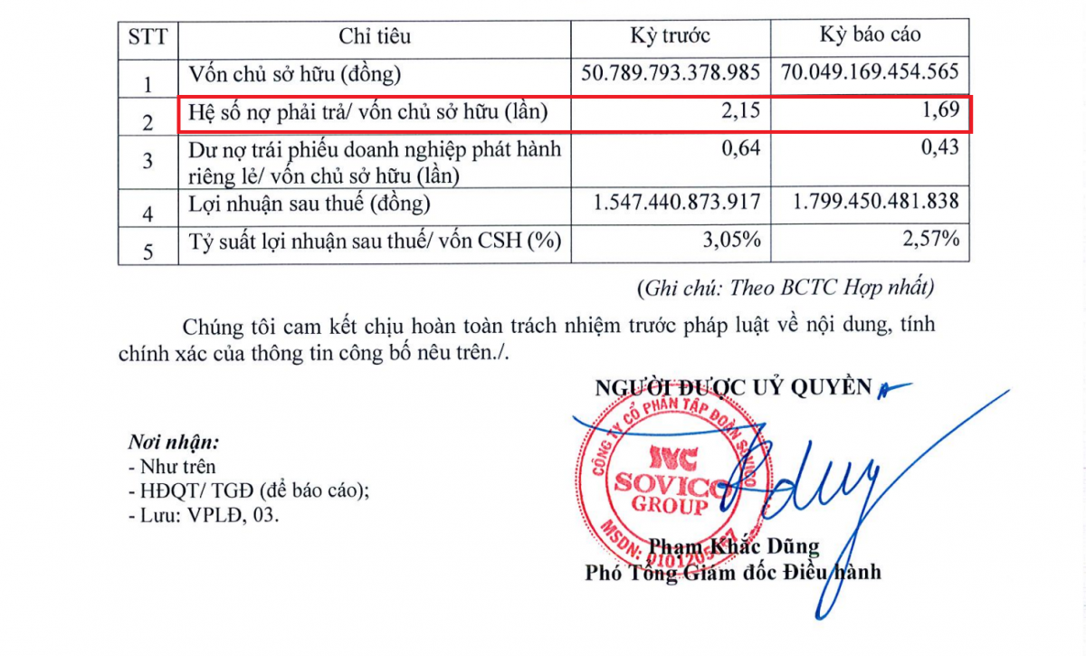 Việc tăng vốn chủ sở hữu sẽ giảm áp lực với hệ số nợ phải trả/vốn chủ sở hữu. Theo đó, hệ số nợ phải trả/vốn chủ sở hữu của Sovico Group đã giảm từ 2,15 lần còn 1,69 lần, nhưng thực chất quy đổi ra giá trị tuyệt đối lại từ mức hơn 109.000 tỉ đồng lên hơn 118.300 tỉ đồng.