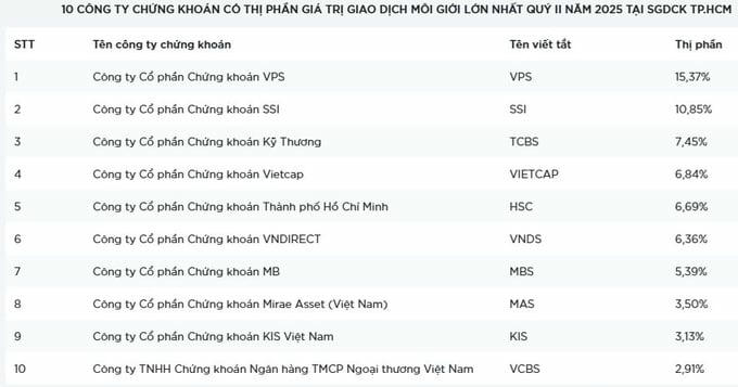 HOSE vừa công bố danh sách 10 công ty chứng khoán có thị phần giao dịch môi giới cổ phiếu, chứng chỉ quỹ và chứng quyền có đảm bảo lớn nhất trong quý 2/2025 bao gồm: VPS, SSI, TCBS, Vietcap, HSC, VNDirect, MBS, Mirae Asset, KIS Việt Nam và FPTS với tổng thị phần 68,49%.