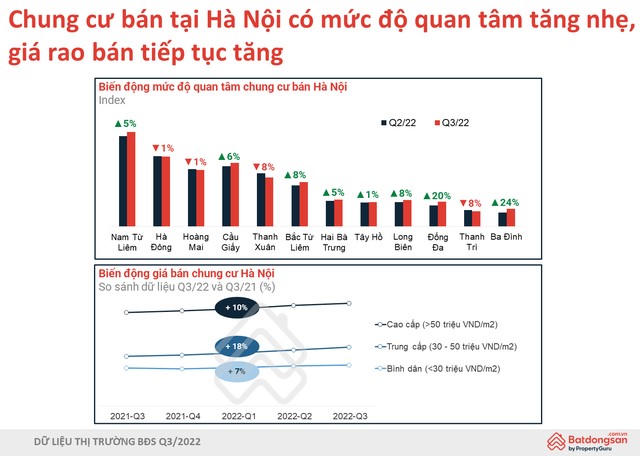 Dữ liệu của Batdongsan.com.vn cho thấy, giá rao bán chung cư Hà Nội trong quý 3/2022 tăng từ 7%-18% so với cùng kỳ năm trước, giá rao bán căn hộ tại TP.HCM cũng tăng từ 4%-5%, tùy phân khúc và vị trí. Giá cho thuê căn hộ chung cư ở nhiều quận thuộc Hà Nội và TP.HCM cũng tăng từ 8-16% ở thời điểm hiện tại.