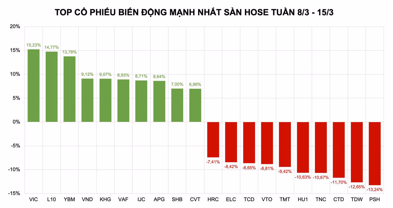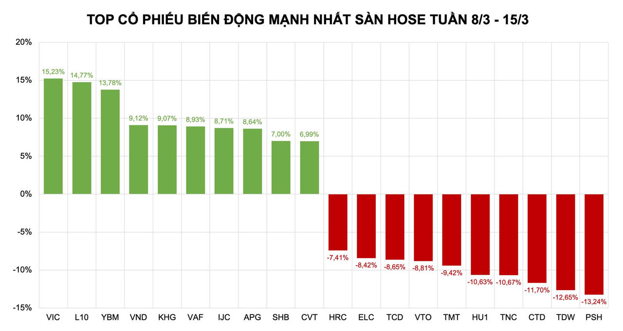 Những cái tên còn lại trong top 10 cổ phiếu tăng mạnh nhất sàn HoSE tuần qua lần lượt thuộc về L10 (+14,77%), YBM (+13,78%), VND (+9,12%), KHG (+9,07%), VAF (+8,93%), IJC (+8,71%), APG (+8,64%), SHB (+7%), CVT (+6,99%).