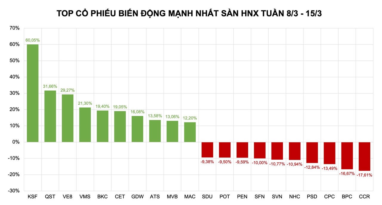 Trên sàn HNX, danh sách 10 cổ phiếu tăng mạnh nhất lần lượt là KSF (+60,05%), QST (+31,66%), VE8 (+29,27%), VMS (+21,30%), BKC (+19,40%), CET (+19,05%), GDW (+16,08%), ATS (+13,58%), MVB (+13,06%), MAC (+12,20%).