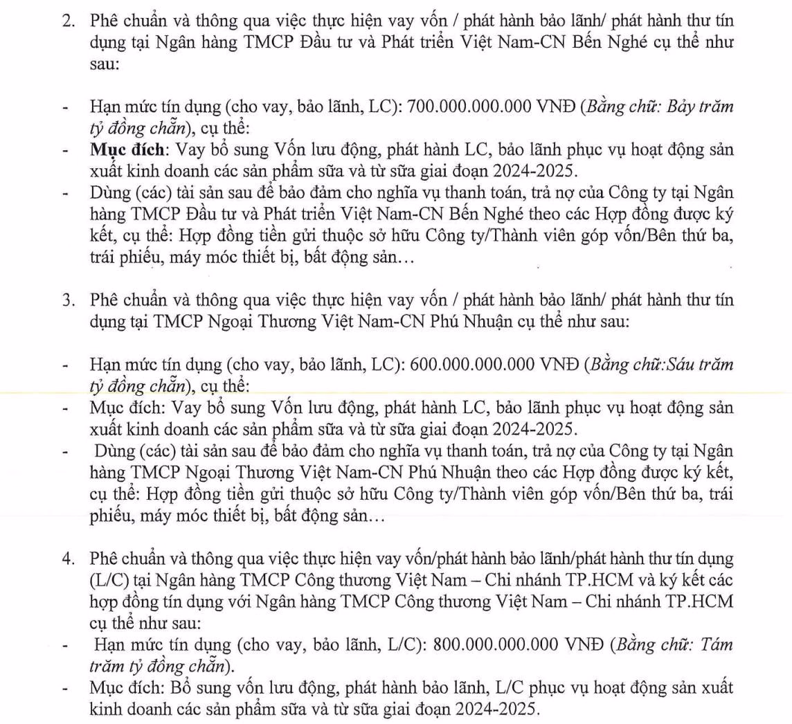 Đại gia ngành sữa cho hay, mục đích vay vốn chủ yếu để bổ sung vốn lưu động, phát hành bảo lãnh, thư tín dụng (LC) phục vụ hoạt động sản xuất kinh doanh các sản phẩm sữa và từ sữa trong giai đoạn 2024-2025.