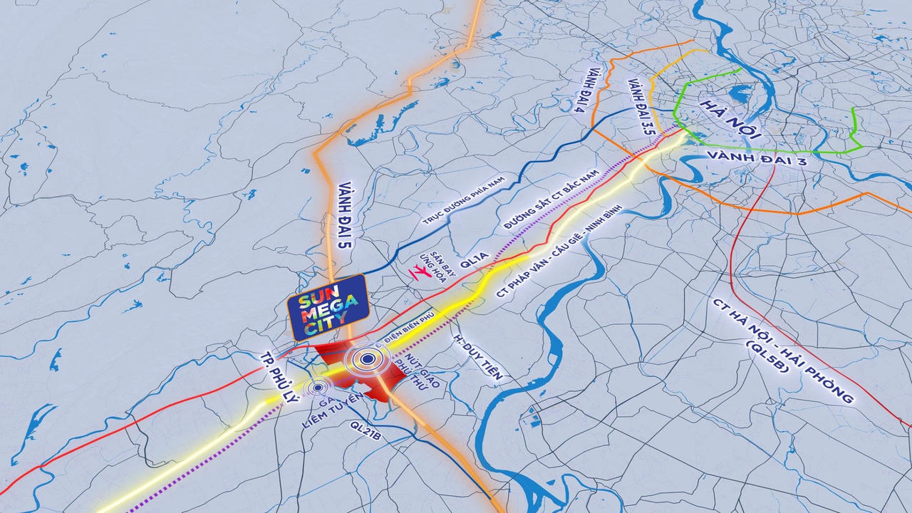 Là dự án trung tâm tại vùng đất đang được đầu tư mạnh mẽ về hạ tầng, Sun Mega City kết nối hoàn hảo với trong – ngoài nước nhờ hệ thống giao thông huyết mạch: Quốc lộ 1A, cao tốc Pháp Vân - Cầu Giẽ - Ninh Bình, các tuyến vành đai 3.5, 4, 5 và nút giao Phú Thứ. Đặc biệt, hai “siêu dự án” tương lai – đường sắt cao tốc Bắc – Nam với ga Phủ Lý và sân bay thứ hai vùng Thủ đô tại Ứng Hòa (cách 25km) – sẽ nâng tầm Sun Mega City thành trung tâm giao thương toàn quốc và quốc tế. Địa thế phong thủy thịnh vượng hiếm có bên ba dòng sông cổ: sông Đáy, sông Nhuệ, sông Châu Giang càng tô đậm sức hút của siêu đô thị này, đồng thời mở ra tuyến kết nối giao thương đường thủy thuận lợi. Không quá khi nói, mọi ngả đường đều đang đổ về Sun Mega City.