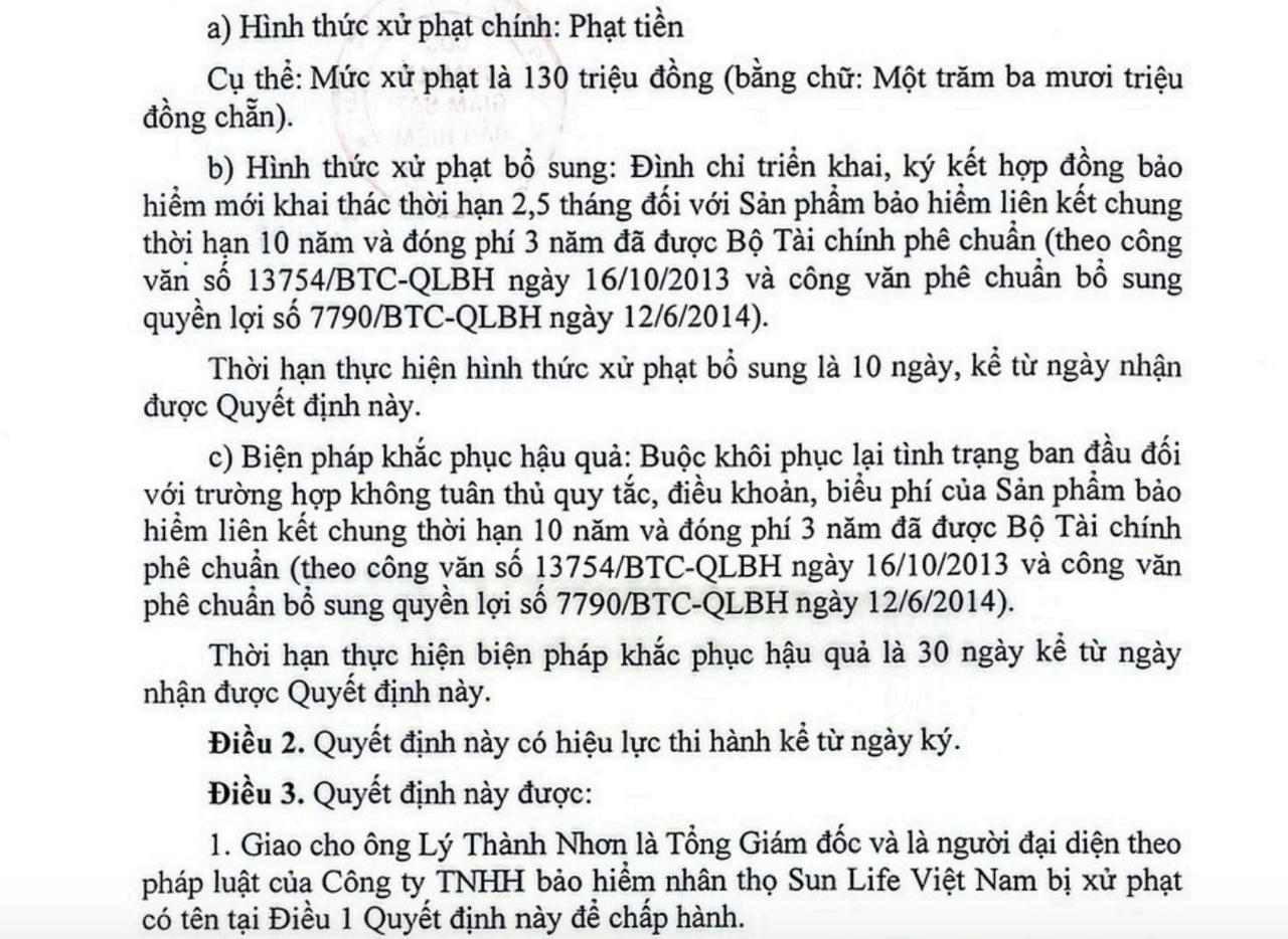 Đáng chú ý, Sun Life còn bị phạt vì hành vi không tuân thủ quy tắc, điều khoản, biểu phí của sản phẩm bảo hiểm liên kết chung đóng phí 3 năm, bảo vệ 10 năm đã được Bộ Tài chính phê chuẩn. Đối với hành vi không tuân thủ này, Sun Life bị phạt tiền với mức xử phạt là 130 triệu đồng.