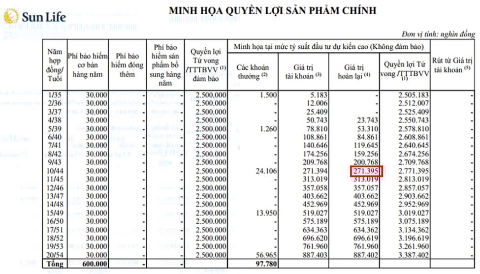 Cụ thể, Sun Life đã cung cấp bảng minh hoạ bán hàng của sản phẩm bảo hiểm liên kết chung đóng phí 3 năm, bảo vệ 10 năm không rõ ràng, không đầy đủ và chính xác để giúp khách hàng có sự lựa chọn phù hợp.