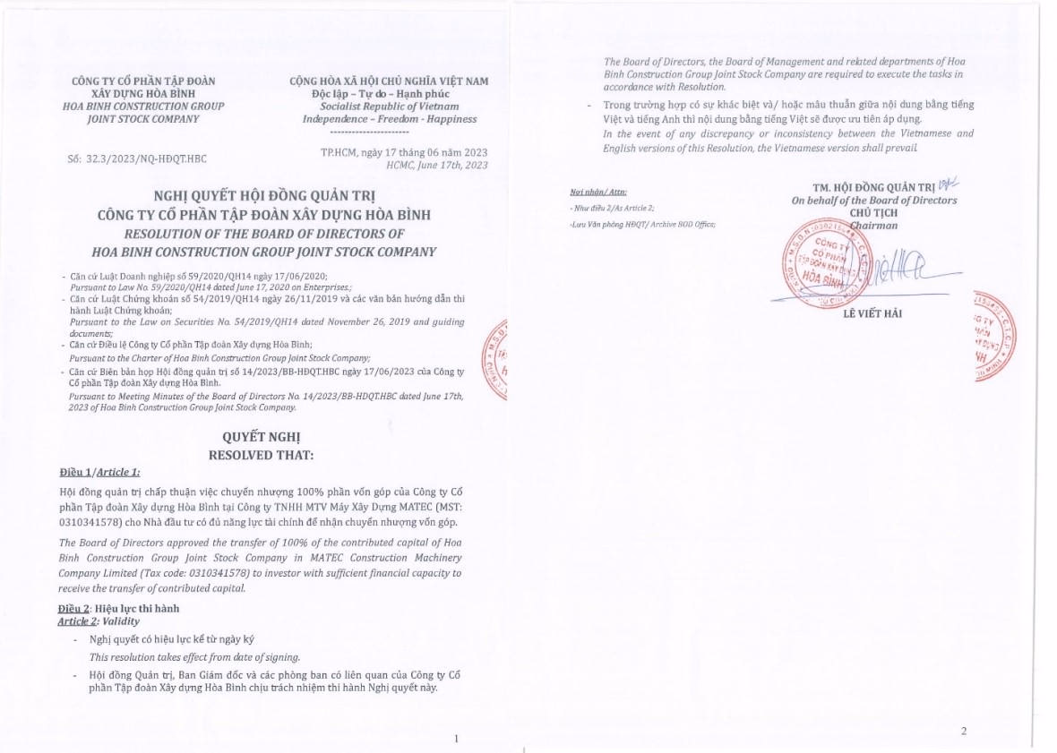Mới đây, Hòa Bình đã công bố nghị quyết của Hội đồng quản trị (HĐQT) thông qua việc chuyển nhượng 100% vốn góp của tập đoàn tại Công ty TNHH MTV Máy Xây dựng MATEC (công ty con, quản lý khai thác toàn bộ số thiết bị máy móc của Hòa Bình) cho nhà đầu tư Ashita Group với giá 1.100 tỷ đồng. Số tiền này sẽ bổ sung vào vốn lưu động cho Xây dựng Hòa Bình.