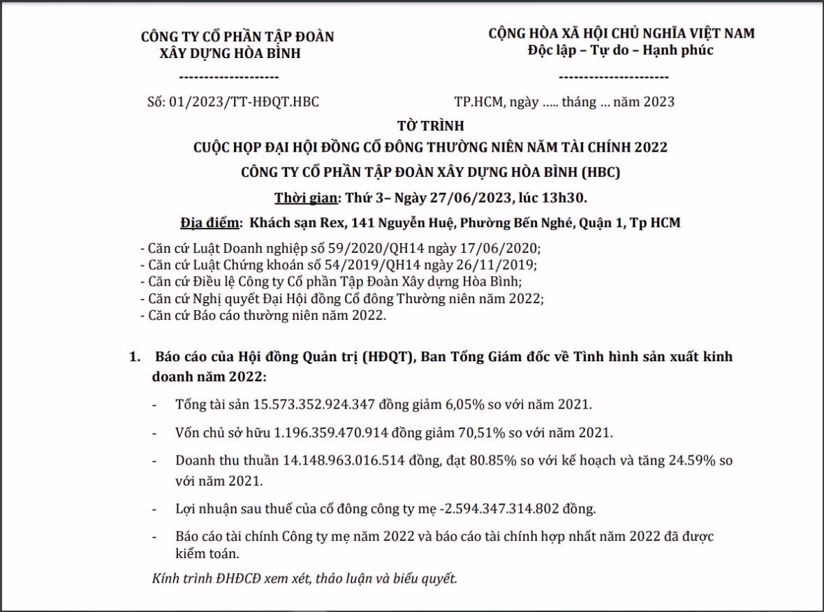 Hiện tại, mặc dù Hòa Bình chưa công bố báo cáo tài chính kiểm toán năm 2022. Tuy nhiên, theo tờ trình dự kiến trình tại cuộc họp đại hội đồng cổ đông (ĐHĐCĐ) thường niên 2023 tổ chức ngày 27/6 tới đây, HBC cho biết đã có trong tay báo cáo tài chính kiểm toán, với các số liệu biến động mạnh.