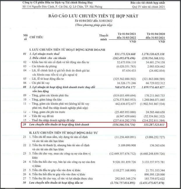 Đáng chú ý, dòng tiền thuần từ hoạt động kinh doanh của Hoàng Huy đã chuyển từ dương 333 tỷ đồng sang âm 354 tỷ đồng tại thời điểm cuối niên độ 2021-2022 chủ yếu do tăng mạnh các khoản phải thu và tồn kho lớn.