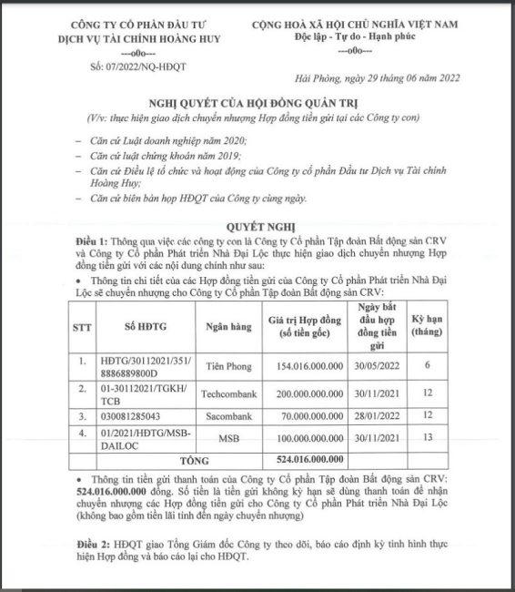 Cùng ngày với nghị quyết về việc vay 300 tỷ từ Nhà Đại Lộc, Tài Chính Hoàng Huy còn thông qua nghị quyết về việc các hợp đồng tiền gửi của Nhà Đại Lộc sẽ chuyển nhượng cho CTCP Tập đoàn Bất động sản CRV (cũng là thành viên của TCH).