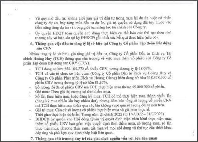 Cũng tại Tờ trình cổ đông vào ngày 14/6/2022, Hoàng Huy đã thông qua kế hoạch mua thêm 45 triệu cổ phần của bất động sản CRV. Hiện tại, TCH đang sở hữu hơn 256 triệu cổ phiếu CRV (tương đương 38.09%). Trong khi đó TCH và các tổ chức có liên quan (Công ty Cổ phần Đầu tư Dịch vụ Hoàng Huy và Công ty Cổ phần phát triển Dịch vụ Hoàng Giang) đang sở hữu hơn 538,3 triệu cổ phiếu CRV (tương đương 81,67%).