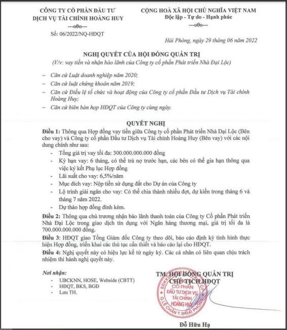 Tại Nghị quyết HĐQT của Tài chính Hoàng Huy công bố mới đây về việc vay tiền và nhận bảo lãnh của Công ty Cổ phần Phát triển Nhà Đại Lộc có nêu rõ Hoàng Huy sẽ vay tối đa 300 tỷ đồng từ Nhà Đại Lộc. Khoản vay có kỳ hạn 6 tháng, có thể trả nợ trước hạn với lãi suất 6,5%/năm.