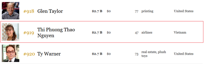 Theo xếp hạng của Forbes, tỷ phú Nguyễn Thị Phương Thảo đang xếp thứ 919 trong danh sách những người giàu nhất thế giới.