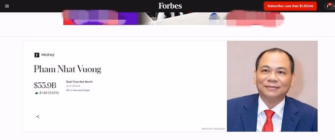 Theo dữ liệu cập nhật thời gian thực của Forbes, tính đến sáng 23/4, ông Phạm Nhật Vượng - Chủ tịch Vingroup đang sở hữu 33,9 tỷ USD, tăng 1,8 tỷ USD, xếp thứ 67 trong danh sách tỷ phú giàu nhất thế giới, đồng thời là đại diện duy nhất của Đông Nam Á có mặt trong top 100 người giàu nhất thế giới ở thời điểm hiện tại.