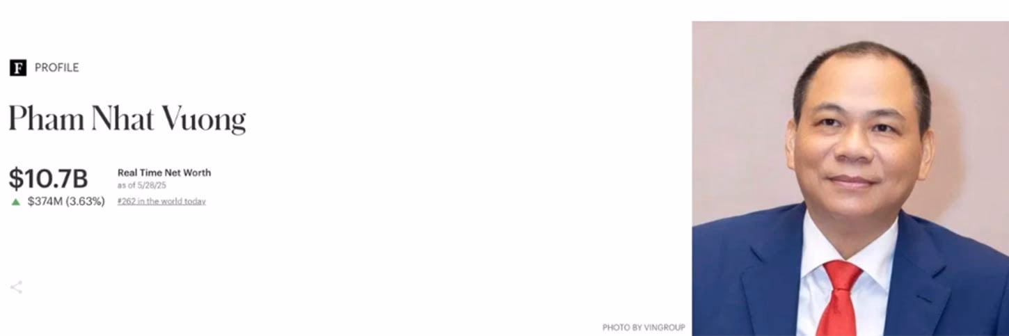 So với đầu tháng 4 - khi Forbes công bố danh sách tỷ phú thế giới năm 2025 (tức gần 2 tháng), tài sản của chủ tịch Vingroup đã tăng thêm hơn 4 tỷ USD.