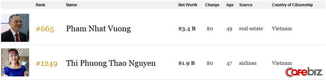 Theo thống kê của Forbes, Việt Nam hiện chỉ có 2 tỷ phú USD, là ông Phạm Nhật Vượng và bà Nguyễn Thị Phương Thảo, CEO Vietjet Air. Tài sản của bà Thảo cũng đang tăng mạnh kể từ đầu năm, từ 1,2 tỷ USD đã lên 1,94 tỷ USD, lọt vào top 1.300 người giàu nhất hành tinh.