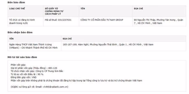 Đáng lưu ý, theo hồ sơ tài chính của Nam Group đang thế chấp phần vốn góp 531,432 tỷ đồng tương ứng với 99% cổ phần của Công ty TNHH Trung Sơn Bắc tại Ngân Hàng TMCP Việt Nam Thịnh Vượng (VPBank) – Chi Nhánh Thành Phố Hồ Chí Minh, số hợp đồng SME/HCM/19/0001/HDTCPVG-01, ngày ký hợp đồng: 15/01/2019.
