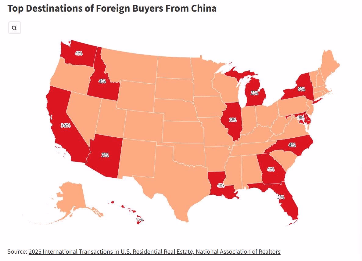 California tiếp tục là điểm đến hàng đầu của người mua nhà Trung Quốc, chiếm 36% tổng số giao dịch của họ tại Mỹ. Xếp sau là Maryland và New York (mỗi bang chiếm 9%), Hawaii (5%), Georgia, Idaho, Louisiana, Bắc Carolina và Washington (mỗi bang 4%), tiếp đến là Arizona, Delaware và Florida (mỗi bang 3%).
