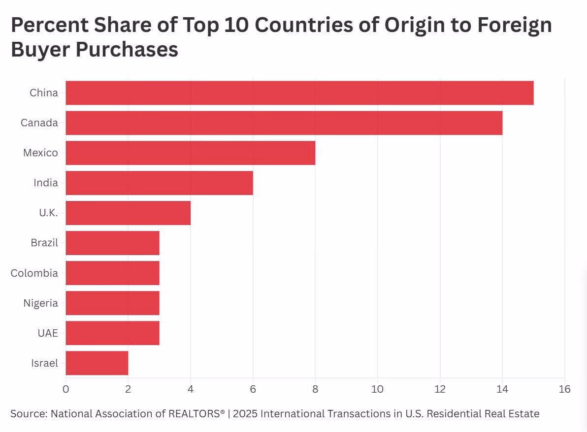 Theo báo cáo mới nhất của Hiệp hội Môi giới Bất động sản Quốc gia Mỹ (NAR) về các giao dịch quốc tế trong lĩnh vực bất động sản nhà ở, người mua Trung Quốc đã chi 13,7 tỷ USD trong tổng số 56 tỷ USD mà người nước ngoài bỏ ra để mua nhà tại Mỹ, trong giai đoạn từ tháng 4/2024 đến tháng 3/2025.
