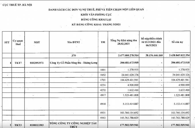 Theo danh sách công khai 2.026 người nộp thuế nợ thuế, phí, nghĩa vụ tài chính về đất và tiền chậm nộp liên quan của Cục Thuế TP. Hà Nội, tính đết hết năm 2021, Công ty CP Sông Đà - Thăng Long đứng đầu với số tiền nợ thuế lên tới hơn 384,6 tỷ đồng.