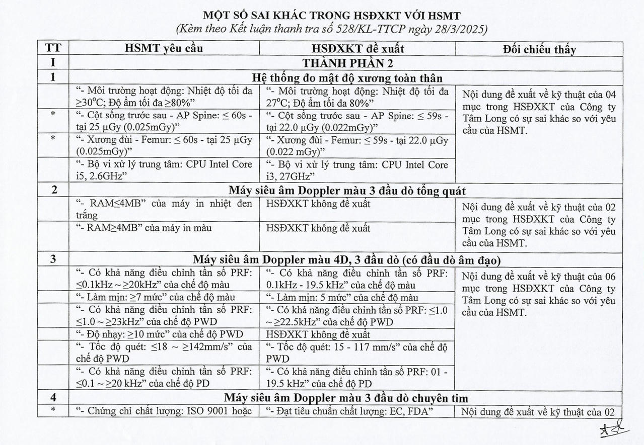 Theo kết luận, trong hồ sơ của Công ty Tâm Long tham dự TP2 của gói thầu TBYT BM-01, có tài liệu là Bảng so sánh đáp ứng kỹ thuật của Hệ thống đo mật độ xương toàn thân và Bảng so sánh đáp ứng kỹ thuật của Máy siêu âm Doppler màu 3 đầu dò tồng quát được Giám đốc Công ty Tâm Long ký và đóng dấu ngày 18/9/2019, trước ngày phát hành HSMT (HSMT được phát hành vào ngày 30/9/2019).