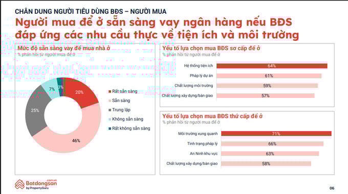 Về mức độ sẵn sàng vay để mua nhà, 66% cho biết sẵn sàng hoặc rất sẵn sàng, 25% ở mức trung lập, 10% không sẵn sàng vay. Khi lựa chọn sản phẩm sơ cấp để ở, người mua đặc biệt quan tâm đến tiện ích, tiếp theo là tính pháp lý, chất lượng môi trường sống và tiêu chuẩn xây dựng, bàn giao. Tương tự, với bất động sản thứ cấp, những yếu tố ưu tiên gồm môi trường xung quanh, pháp lý, an ninh khu vực và chất lượng công trình.