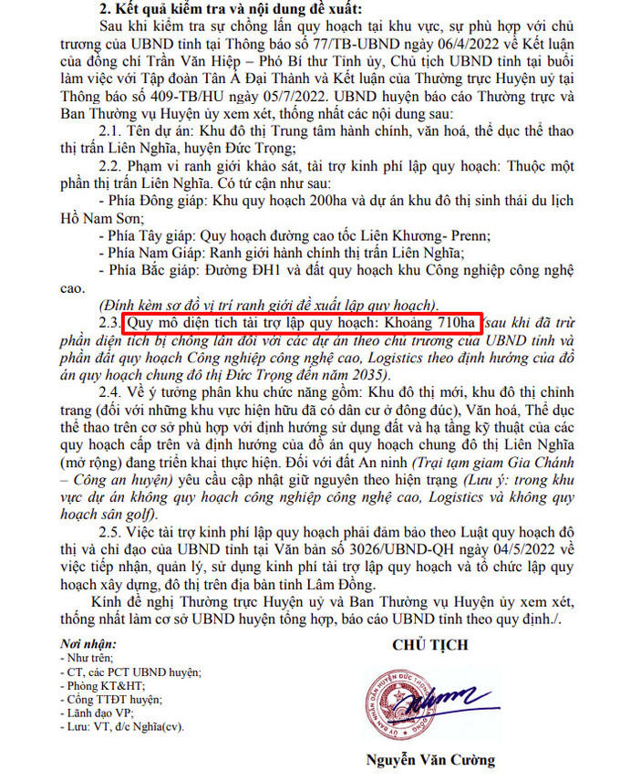 Văn bản nêu rõ, thực hiện ý kiến chỉ đạo của Chủ tịch UBND tỉnh Lâm Đồng và Thường trực huyện ủy Đức Trọng, UBND huyện Đức Trọng đã kiểm tra, rà soát phạm vi ranh giới và ý tưởng nghiên cứu khảo sát, đề xuất lập dự án đầu tư dự án nói trên.