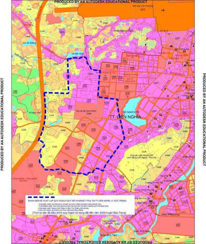 Phạm vi ranh giới khảo sát, tài trợ kinh phí lập quy hoạch thuộc một phần thị trấn Liên Nghĩa. Ranh giới khu vực quy hoạch có phía Đông giáp khu quy hoạch 200 ha và dự án Khu đô thị sinh thái du lịch Hồ Nam Sơn; phía Tây giáp quy hoạch đường cao tốc Liên Khương- Prenn; phía Nam giáp ranh giới hành chính thị trấn Liên Nghĩa; phía Bắc giáp đường ĐH1 và đất quy hoạch khu công nghiệp công nghệ cao.