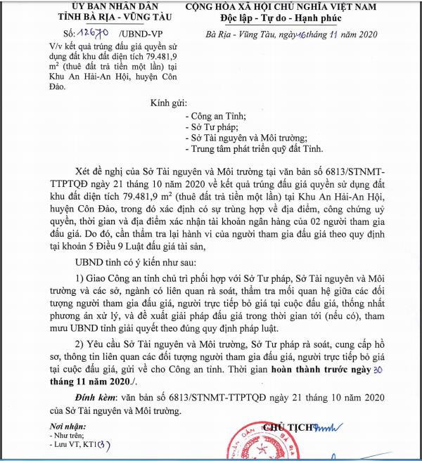 UBND tỉnh Bà Rịa - Vũng Tàu vừa có văn bản số 12670/UBND-VP gửi Công an tỉnh, Sở Tư pháp, Sở Tài nguyên và Môi trường, Trung tâm Phát triển quỹ đất tỉnh về kết quả trúng đấu giá quyền sử dụng đất khu đất diện tích 79.481 m2 (thuê đất trả tiền một lần) tại khu An Hải - An Hội, huyện Côn Đảo.