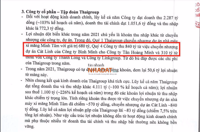 Cụ thể, Tại tài liệu Đại hội cổ đông năm 2022 của Thaiholdings công bố thông tin cho biết quý 4/2021 tập đoàn này đã chuyển nhượng dự án Cát Linh của Công ty Bình Minh Group (11A Cát Linh) cho Công ty Tân Hoàng Minh và thu về 840 tỷ đồng.