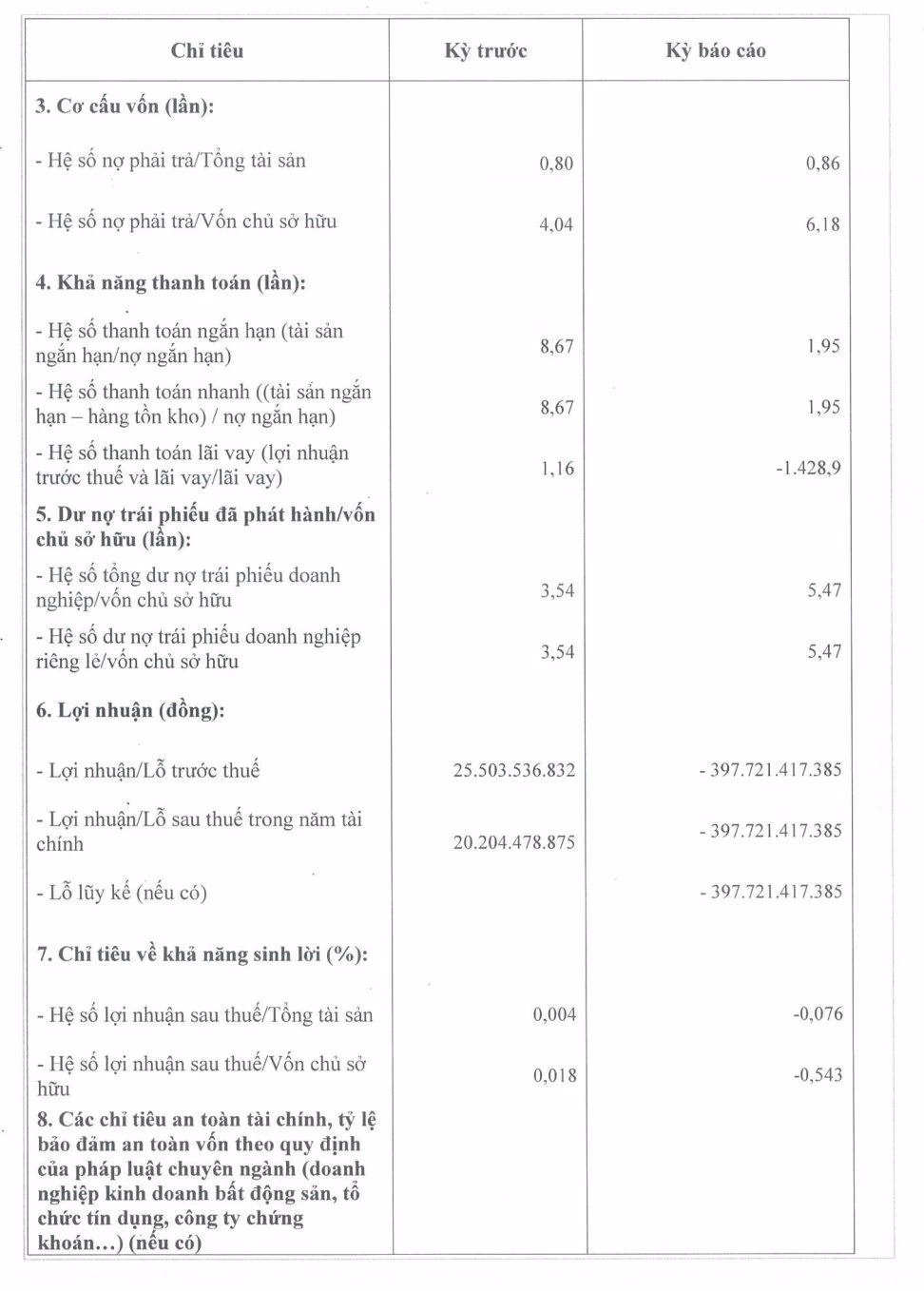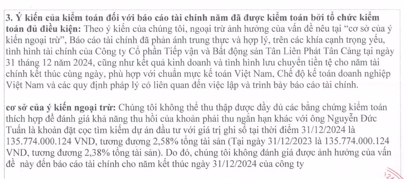 Liên quan đến báo cáo tài chính đã kiểm toán, kiểm toán viên đã đưa ra ý kiến ngoại trừ khi không thể thu thập đầy đủ bằng chứng kiểm toán để đánh giá khả năng thu hồi khoản phải thu ngắn hạn hơn 135,7 tỷ đồng đối với ông Nguyễn Đức Tuấn khoản tiền đặt cọc tìm kiếm dự án chiếm 2,58% tổng tài sản cuối năm 2024. Kiểm toán viên cũng không đưa ra được nhận định về ảnh hưởng của khoản phải thu này đối với báo cáo tài chính năm 2024 của doanh nghiệp.