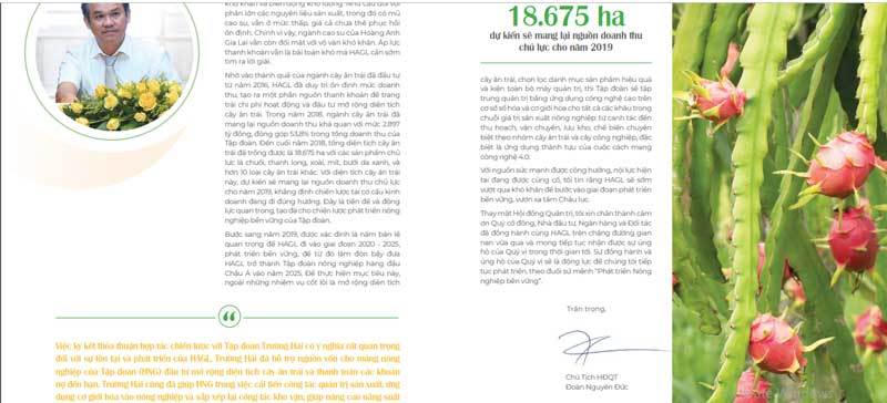 Cũng theo Bầu Đức, nhờ vào thành quả của ngành cây ăn trái đã đầu tư từ năm 2016, HAGL đã duy trì ổn định mức doanh thu, tạo ra một phần nguồn thanh khoản để trang trải chi phí hoạt động và đầu tư mở rộng diện tích cây ăn trái.